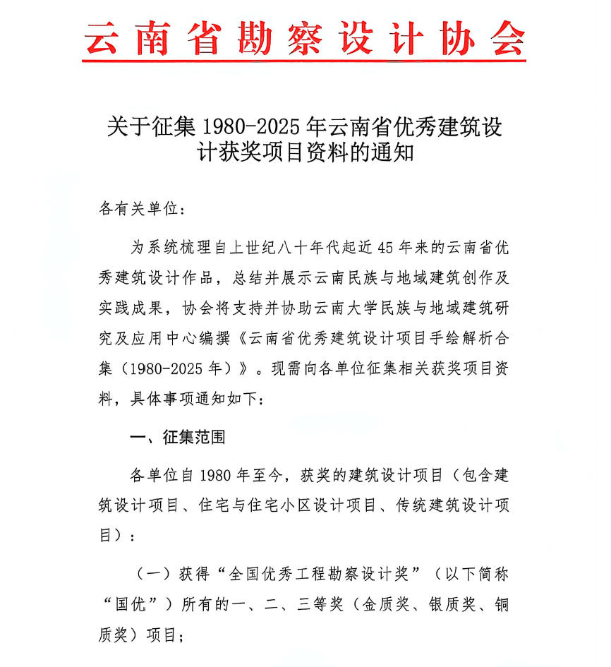 關(guān)于征集1980-2025年云南省優(yōu)秀建筑設(shè)計(jì)獲獎(jiǎng)項(xiàng)目資料的通知.pdf