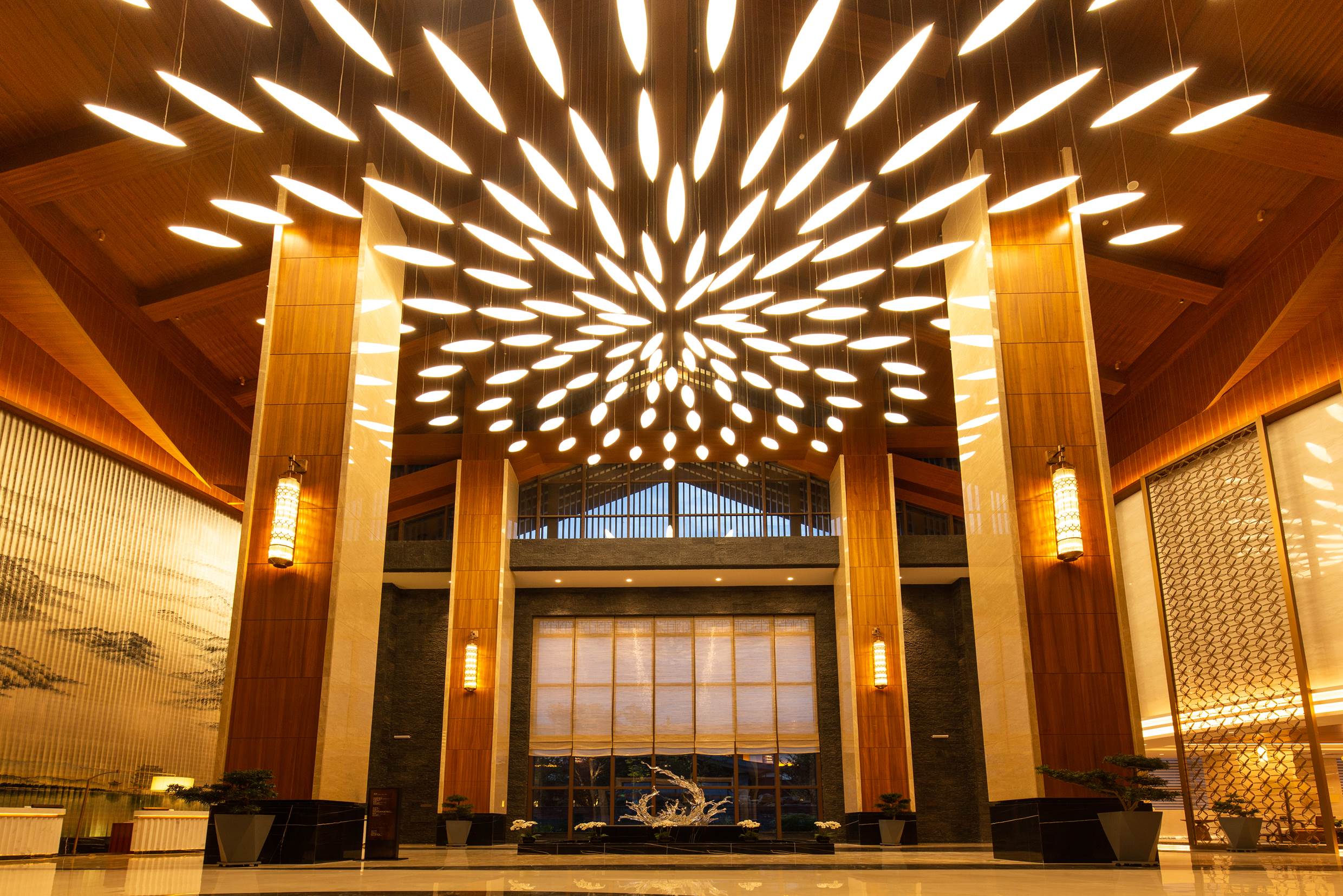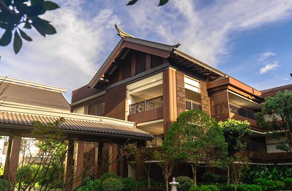 酒店整體呈島式布局,以酒店主樓為核心的建筑群,按照地形環(huán)境的特點(diǎn),以環(huán)抱態(tài)勢沿道路、湖灣進(jìn)行分散布局。在保證城市界面連續(xù)性的基礎(chǔ)上,使酒店的城市形象更加完整積極。酒店主樓為地上2-4層,屋脊高度約16~27米不等,建筑長度約240米,大體量的酒店主樓領(lǐng)銜打造了沿街一側(cè)的宏偉建筑形象,結(jié)合平面的收進(jìn)、屋頂?shù)母叩徒诲e(cuò)等手法,讓大體量的建筑又顯得更加自然、生動(dòng),最終回歸到自然當(dāng)中。高端客房、合院客房等采用體量較小、高度較低矮的建筑則沿湖灣方向展開布置,完美的契合了湖灣的自由曲線形態(tài),靠內(nèi)圍合出院落空間,靠外使建筑具有良好的親水性。同時(shí),合理利用建筑的間隙以及高低錯(cuò)落的關(guān)系,保證所有公共功能用房皆有良好的景觀視野。